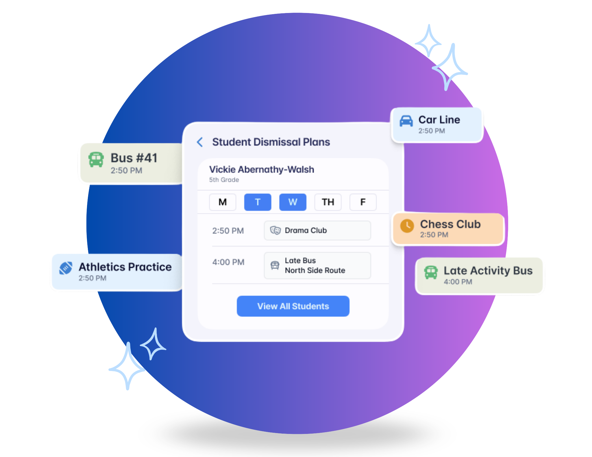 When a parent calls or emails with a schedule change, the coordinator enters it once, and every staff member who needs to know can see it in real time. No more walking a note down the hall to the teacher on bus duty. No more radioing the gym and hoping the message lands. The front office, the car line, the classroom teacher, and the after-school coordinator are all looking at the same live information.