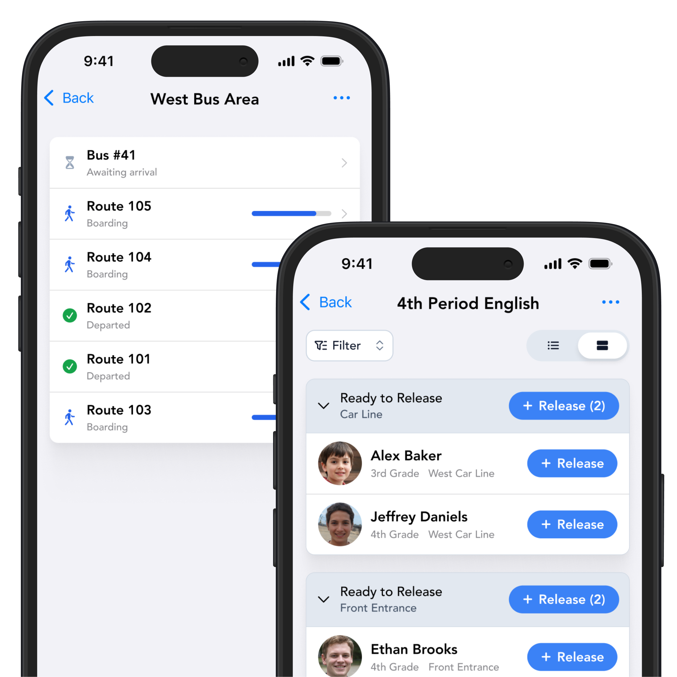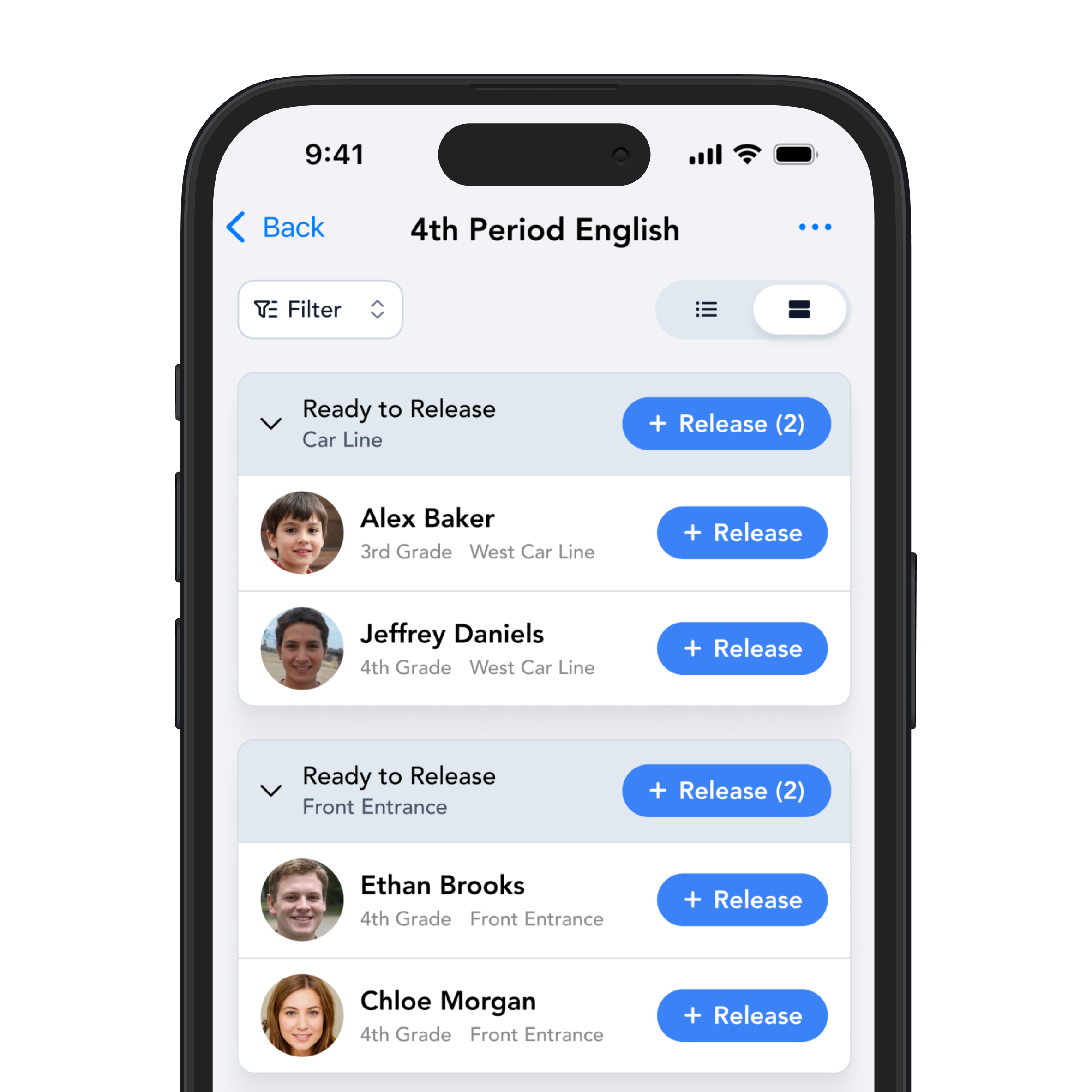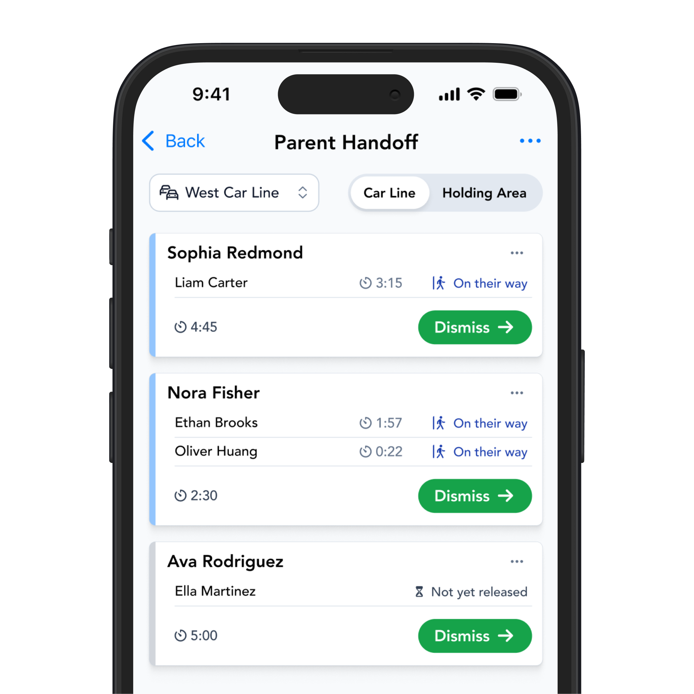 No more shouting names across a parking lot. Parents scan in or are identified by staff. Their students instantly appear as ready to release from the classroom or common area — no radios, no paper lists, no miscommunication.