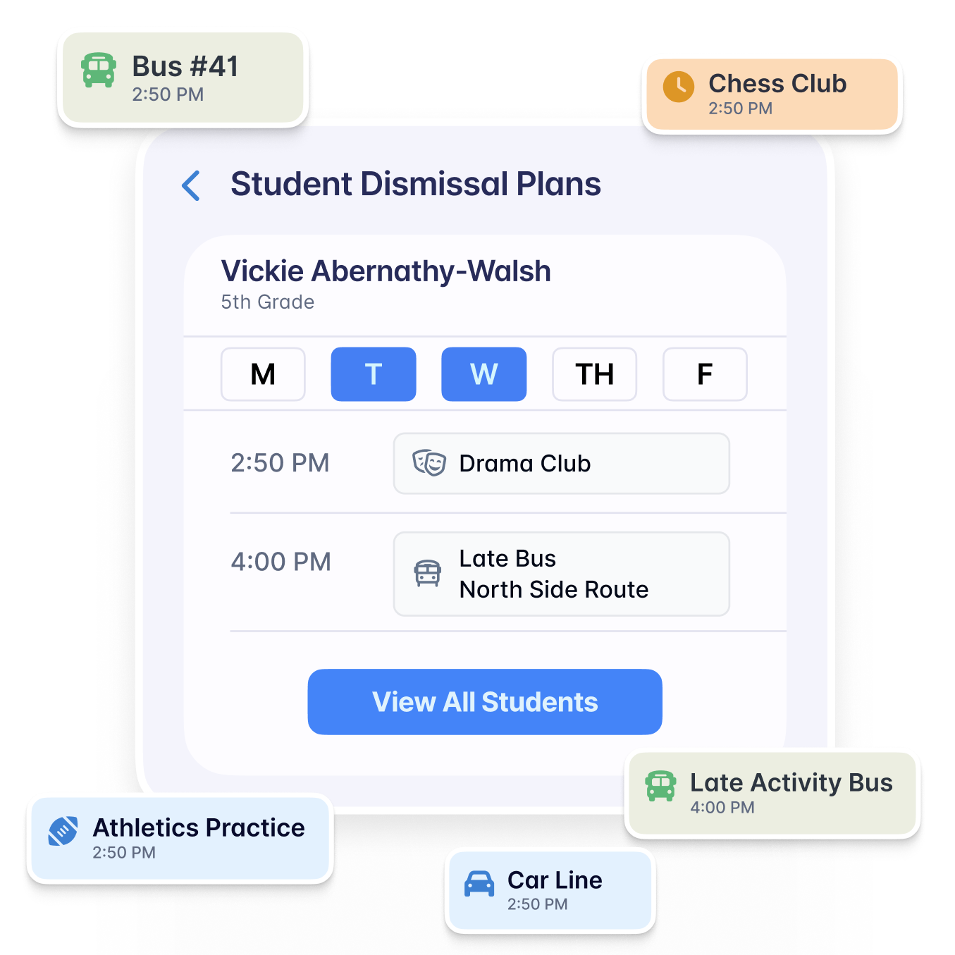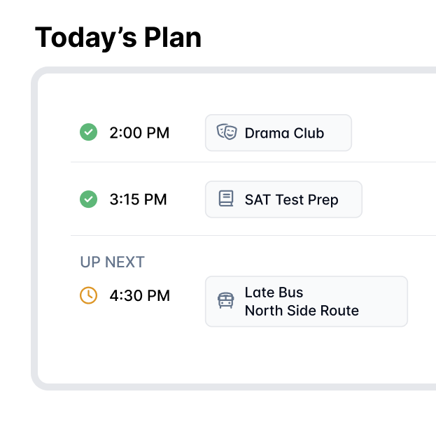 Daily lists of who is riding which bus, who is staying for after school, and who is getting picked up stay live all day. Absences, early dismissals, plan changes — all reflected automatically.