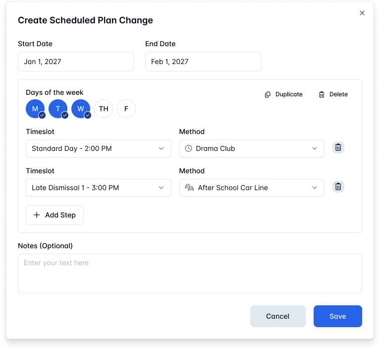 Plan Changes are temporary overrides. When a parent calls and says 'my child is not taking the bus Friday, grandma is picking her up' — that's a plan change. It overrides the default for those date(s) without touching anything else.